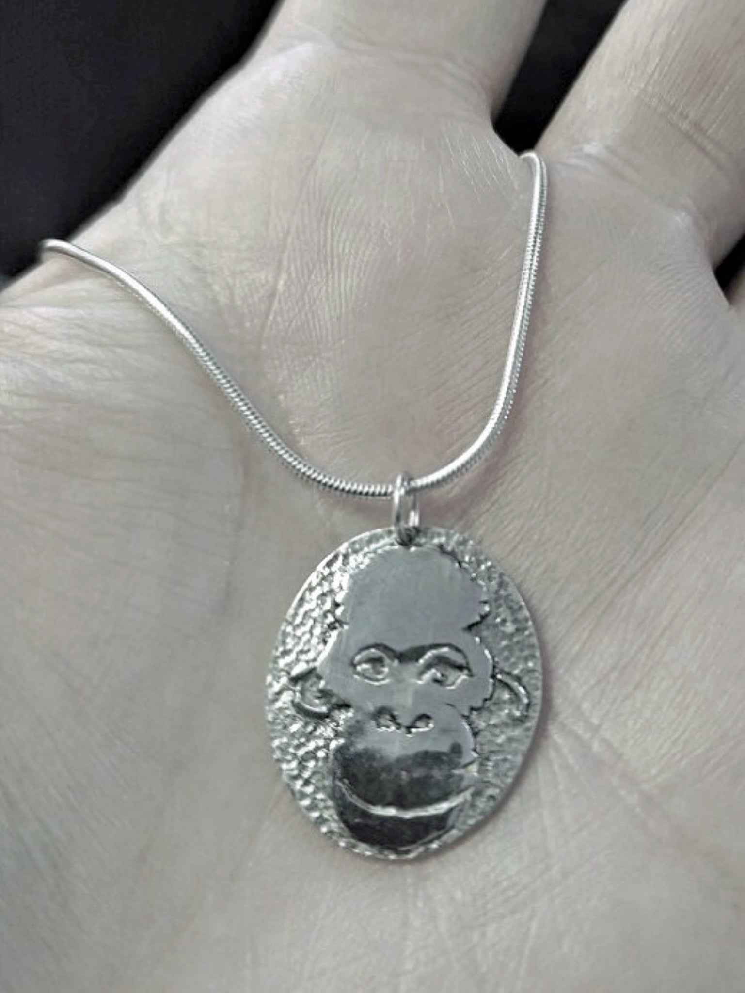 An einer feinen Schlangenkette aus Sterlingsilber ist der ovale Anhänger aus 935er Gusssilber platziert. In der Bearbeitung wird auf Nachhaltigkeit geachtet und auf Chemikalien verzichtet.